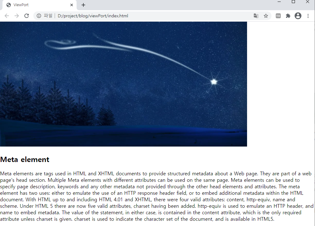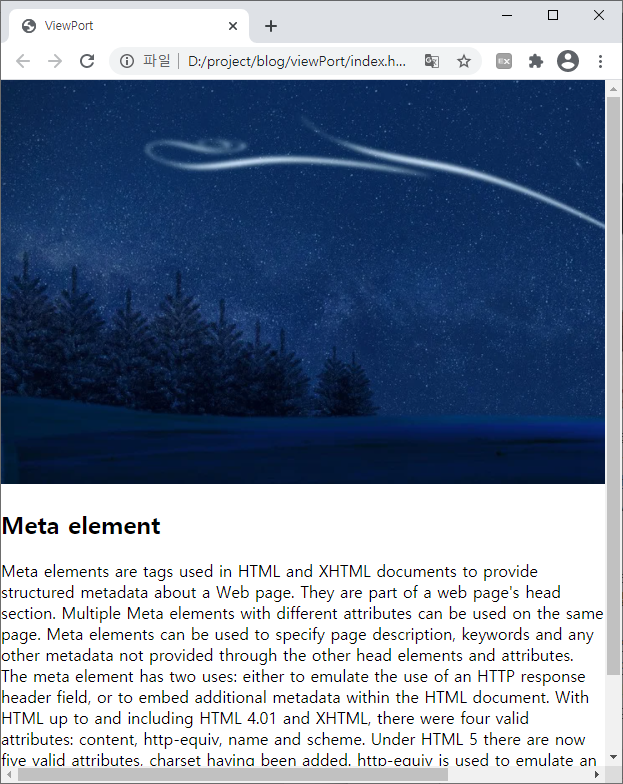 content보다 작은 viewport값을 설정할 경우 적용되지 않기 때문에 이미지의 크기를 width에 꽉차는 100%로 변경해 주겠습니다.