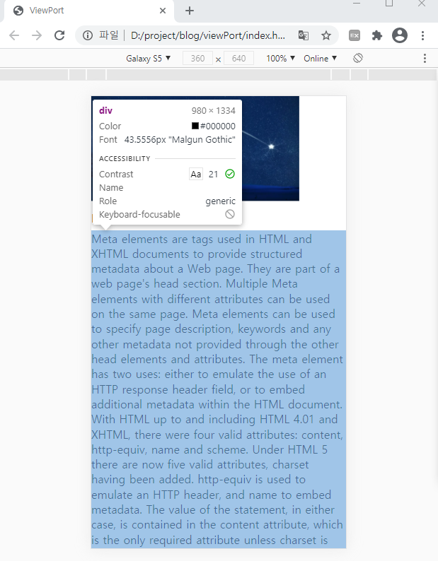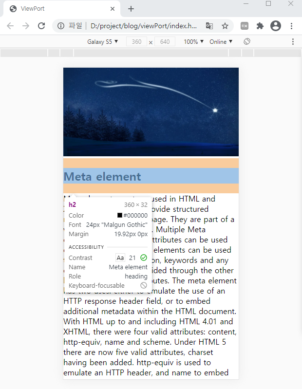 모바일 화면의 경우 width 길이를 360px에 맞춘 웹페이지 내용을 보여주길 원하지만